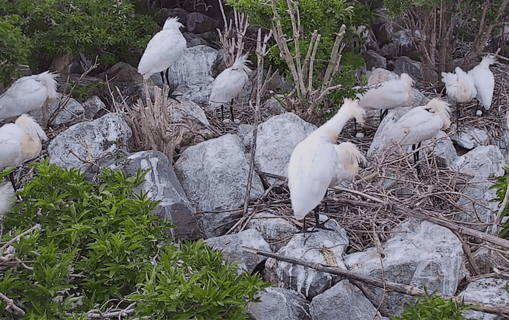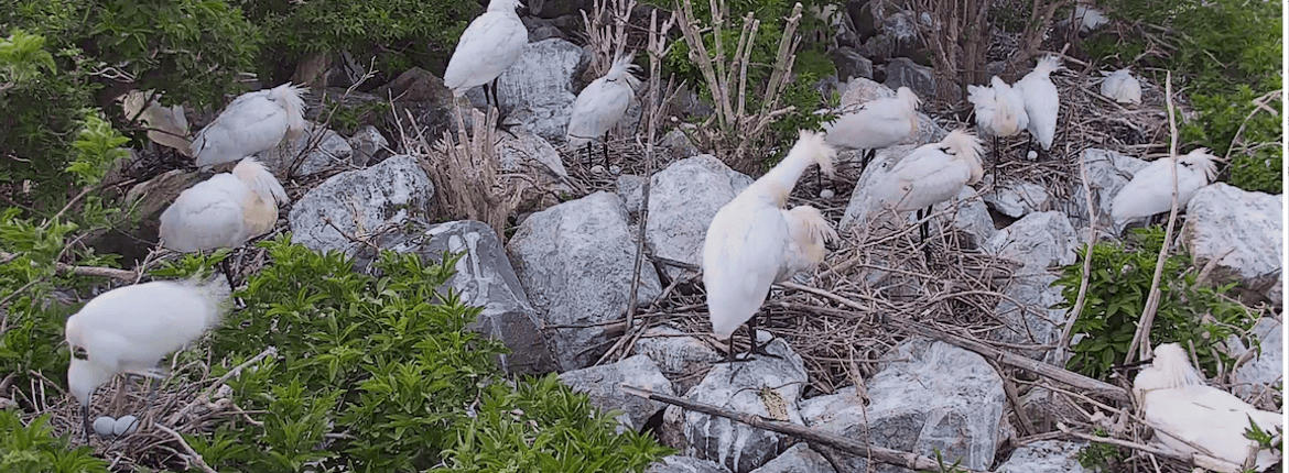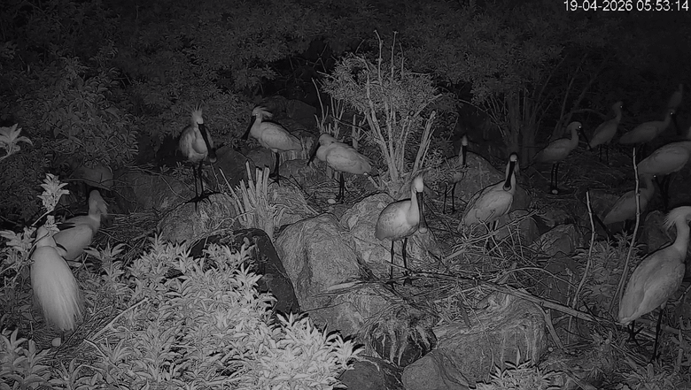 En ja… wat nu dan met de verstoring van de boommarter in de nacht? Eerst nam de boommarter de eieren mee, maar nu laat hij/zij ze liggen. Mogelijk smaken de eieren van de Pontische meeuwen, die ondertussen ook eieren leggen, beter? Maar goed, de boommarter zorgt nog steeds voor verstoring. We horen meeuwen alarmeren en dan gaan alle kopjes van de lepelaars omhoog. Ze kijken heen en weer en dan vertrekken ze. Hoewel vannacht (19-20 april) de eerste lepelaar, de linker achterbuurvrouw op de nestcam bleef zitten.