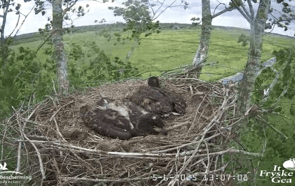 Wanneer het weer omslaat, verandert er ook iets in het gedrag van het zeearendgezin. De jongen, die inmiddels al behoorlijk gegroeid zijn, reageren op de veranderende omstandigheden. Ze trekken hun veren strak aan, drukken zich dieper in het nest en bewegen weinig. Energie besparen is belangrijk, vooral op koude of natte dagen.