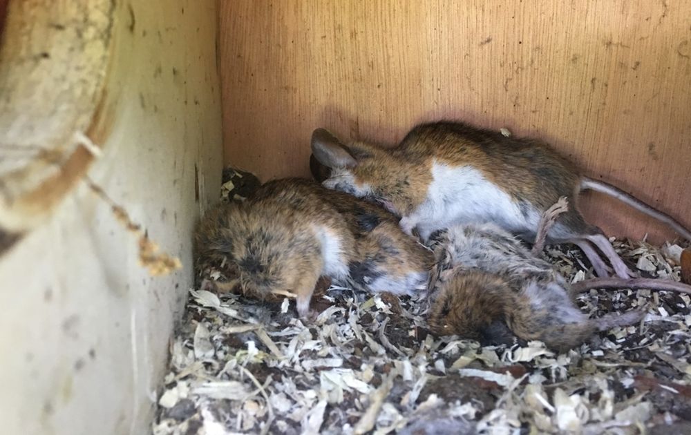 Dat spoort wel een beetje met de eerste ervaringen bij andere nesten. Vrijdag en zaterdag troffen we op veel plekken de nodig muizen in de prooivoorraad. In Meddo lag een voorraad van 7 bosmuizen te wachten op de dingen die gingen komen. De consumenten zaten nog echter nog in de dop, dus hopelijk richten niet eerst de maden een feestmaal aan. Bijzonder was dat een van de muizen nog springlevend was! Minder gezellig voor de muis, maar uit het oogpunt van het vers houden van de prooi wel slim. In Aalten bleken 3 van 5 bosmuizen de grote variant te zijn, de grote bosmuis (Apodemus flavicollis). Op de foto in header liggen ze er vreedzaam bij. We troffen ze eerder in andere jaren (7 stuks in totaal), maar het was de eerste keer dat we er 3 tegelijk aantroffen. Deze grote neef van onze (gewone) bosmuis rukt langzaam vanuit de oostgrens steeds het verder het land in. Voor de steenuil zijn het mooie prooien, bijna dubbel zo zwaar als een (gewone) bosmuis. We zijn benieuwd of er ook een keer een voor de camera verschijnt.