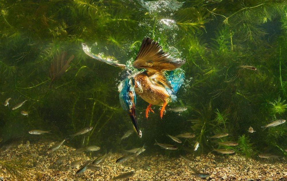 Dankzij het infrarode licht van de camera kunnen wij in de nestkamer kijken. Maar bekend is dat de ijsvogels in het donker in de nestkamer zitten. De jonge vogels hebben bovendien voorlopig de ogen nog dicht. Toch slaagt pa of ma ijsvogel er in de bek van een jong te vinden om de vis over te geven. Het jong heeft daarbij zelf de taak richting de oudersnavel te gaan en voelt daarbij het visje. Heel langzaam wordt daarna het visje ‘overgedragen’ aan het jong. De eerste dag was dat allemaal nog onwennig, maar de jonge ijsvogels hebben de werkwijze snel in de gaten.