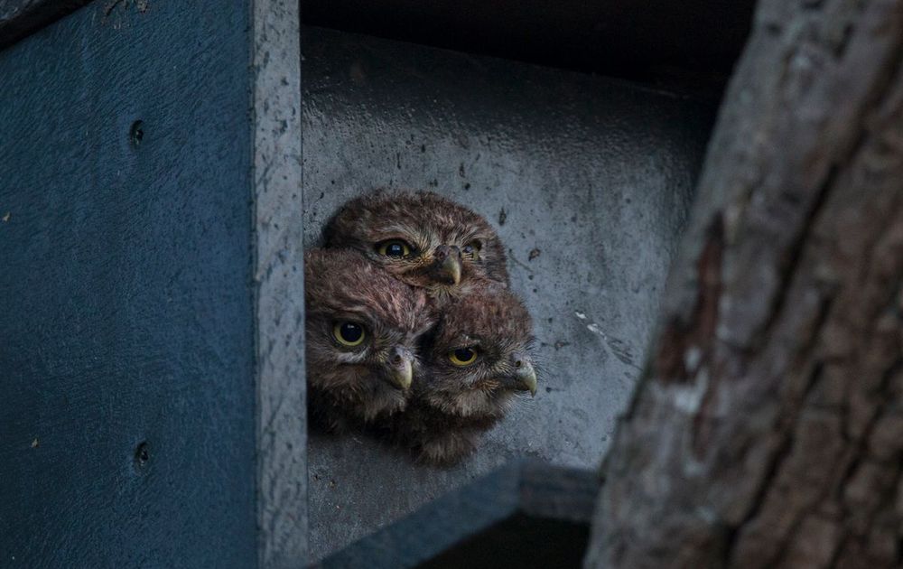 Foto header: drie nestgenootjes bekijken vanuit de invliegopening de wereld buiten de nestkast. Foto: Pauline van Marle.