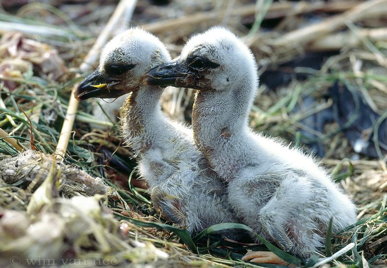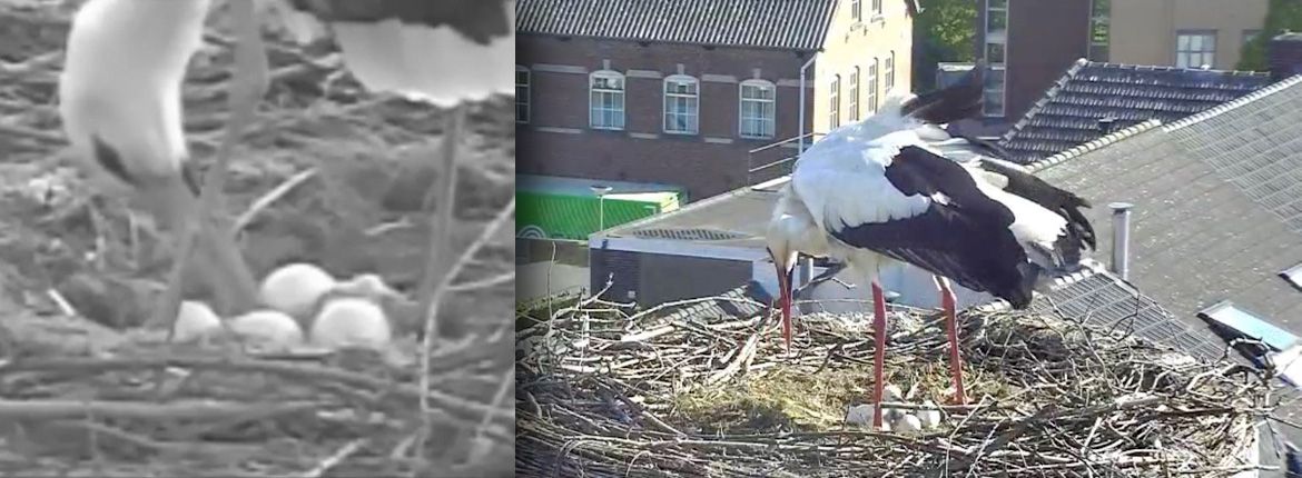 Precies volgens verwachting kwamen de eerste twee kuikens vanmorgen ter wereld. Urenlang ploeteren en dan zijn ze er gewoon. De kopjes nog wankel op de dunne nekjes, wiegend in zon en wind en dan weer teruggeduwd door de buik van vader of moeder.  Nog even doorwarmen, want er liggen meer eieren te wachten op het uitkomen. De derde mogelijk vandaag al, de vierde laat dan weer iets langer op zich wachten.