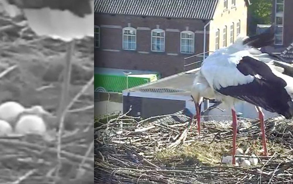 Precies volgens verwachting kwamen de eerste twee kuikens vanmorgen ter wereld. Urenlang ploeteren en dan zijn ze er gewoon. De kopjes nog wankel op de dunne nekjes, wiegend in zon en wind en dan weer teruggeduwd door de buik van vader of moeder. Nog even doorwarmen, want er liggen meer eieren te wachten op het uitkomen. De derde mogelijk vandaag al, de vierde laat dan weer iets langer op zich wachten.