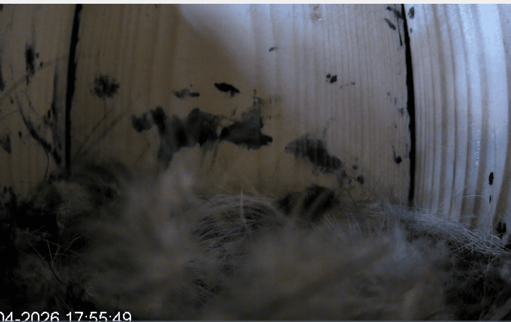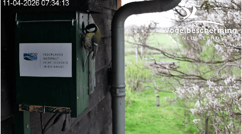 In het filmpje van 11-04-2026, was te zien dat M toch wel beweeglijk was bij de ingang van de broedkast. Hameren doen ze beiden. Vorige week binnen het nest door V en gisteren buiten het nest door M. Het was ook wat vroeger, namelijk om 7:34. Misschien toch wat vroeger met de camera's meekijken? Als we overdag een wandeling maken door het bos, dan zien we de koolmezen op dit moment best druk bezig met nestmateriaal zoeken en eten?