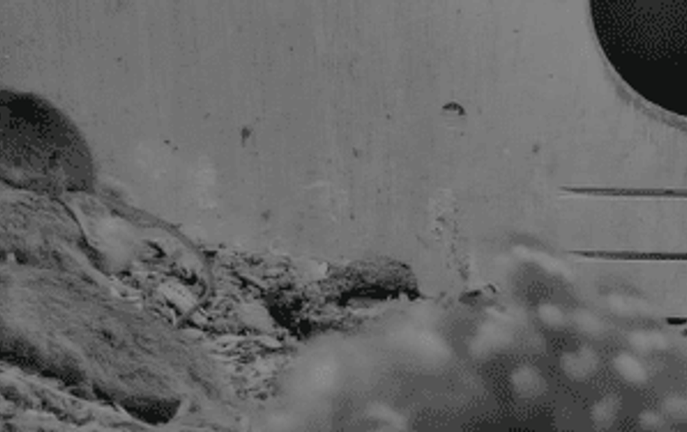 De kijkers vinden het kuiken zwaarlijvig, maar als ik zie hoeveel het nu echt eet, kan het niet obees zijn. En meikever is duidelijk niet het lievelings hapje. In de middag kwam man met een frutsel, vrouw voerde het frutsel terwijl man er aandachtig naar stond te kijken. Oh, voeren, doe je dat zo. Hij probeerde het eerst uit op vrouw, die pakte de hapjes muis wel aan. Toen laat in de avond vrouw weg was kwam hij met een meikever. Een hoop getok, maar de kleine pakte het niet aan. Dan maar op de grond laten vallen. Bij kever drie uit de serie probeerde hij het nog eens. Het blijft aandoenlijk, daar staat ie dan met een kever in zijn snavel. Even later vrouw weer thuis, ziet die kever die op de grond lag, in het looppad, ze pakt 'm op en wierp die meikever achteloos de sluis in. Dat blijkt ineens een goede opbergplaats te zijn. Er is altijd wel wat te zien bij de steenuilen.