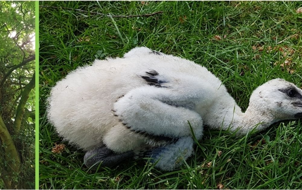 Het afgelopen pinksterweekeinde zit ik in De Lokkerij buiten een boterham te eten, lekker buiten in de tuin. Het is genieten van de klepperende ooievaars, zingende zangvogels en eekhoorns die elkaar in de boomtoppen achterna zitten. Ik kijk naar de kastanjeboom waarin het bovenin ritselt en probeer de eekhoorns te ontdekken. In plaats van een bruine staart, zie en hoor ik een witte prop naar beneden "roetsjen" gevolgd door een "plof". Snel loop in naar de boom en daar op een bedje van bladeren ligt een ooievaarsjong. Mevrouw Koopman legt uit dat ik het op het gras kan leggen om te bekijken. Het jong leeft nog! We bekijken het verder: poten zijn heel, vleugels zijn intact, ogen open en nergens is bloed te zien. Dit is zo'n uitzonderlijke situatie dat een jong een kans maakt om in de opvang op te groeien en na herstel uit te vliegen.