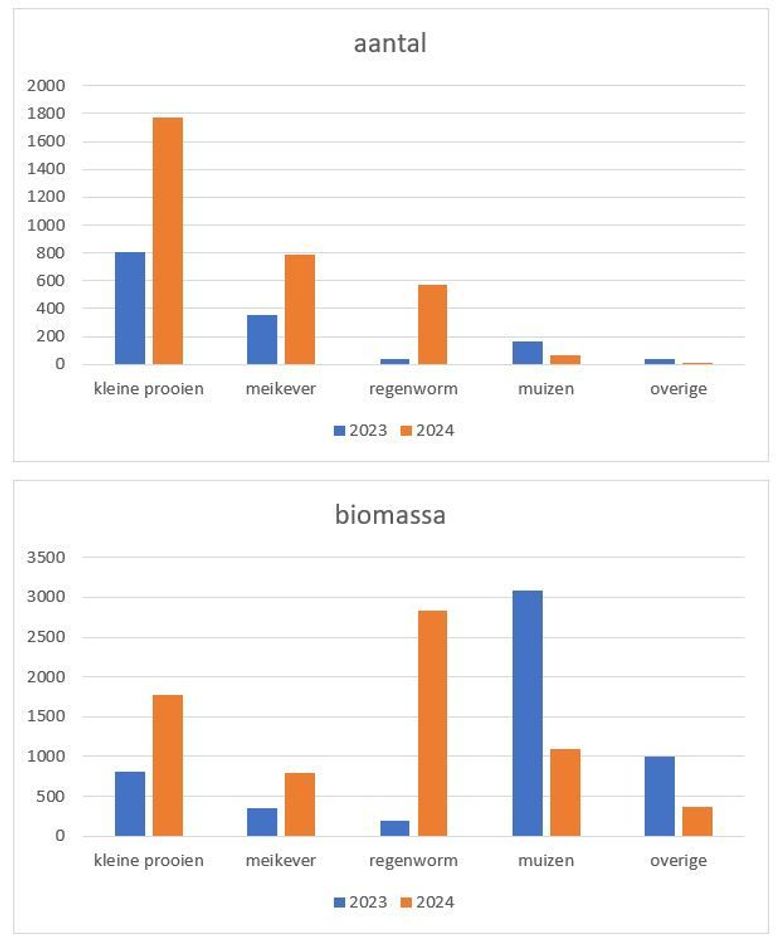 In 2023 werden er veel meer muizen gevangen dan in 2024, 160 tegenover 60. Muizen leverden in 2023 bijna 57% van de biomassa, terwijl ze in 2024 nog voor geen 16% bijdroegen. Om dat verschil te compenseren - er moet tenslotte brood op de plank! - moesten er heel veel andere (kleine) prooien worden gevangen. Dit jaar waren dat vooral regenwormen: 39 in 2023 tegenover 568 in 2024.