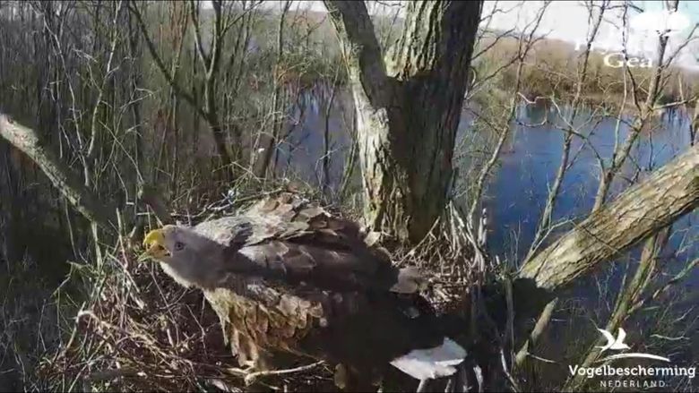 Ze hebben er duidelijk nog steeds een sterke binding mee, gezien het feit dat het zeearend-paar op bezoek blijft komen. Ondanks de stevige aanvallen van de havik. En dit vindt niet alleen plaats in en om het nest, zoals we op de webcam zien. Er wordt ook genoeg geharreward boven het nabij liggende water.
