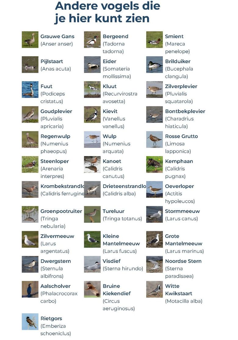 Zang is op deze plek toch een soort van handicap, daar het aan de kust nu eenmaal hard kan waaien. Bovendien zijn de wadvogels nou niet bepaald echte zangvogels. Toch kun je met wat oefening de verschillende geluiden wel uit elkaar houden. Bepaalde steltlopers hebben immers een kenmerkend geluid, neem de tureluur, daar wordt je helemaal tureluurs van. Ook de wulp heeft zo zijn eigen typische geluid, veel geluiden vind je terug in de vogelgids. De vogelgids vind je net boven het camerabeeld, verder vind je daar allerlei info over de betreffende soort. Een geoefend oor kan zo de diverse soorten onderscheiden, zo heeft elke ganzensoort zijn eigen ritme en geluid. Buiten in de natuur, tijdens een wandeling kun je geluid en zicht op de vogel combineren. De vogels die hun eigen naam roepen leer je het snelst. Tjiftjaf, kievit, grutto, tureluur, koekoek, gemakkelijker kunnen we het niet maken.