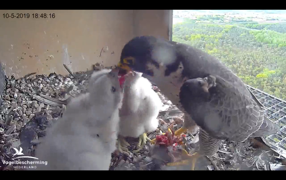 Na een gezonde nachtrust waarin de kuuks slapen en groeien, komt M al voor 6 uur even zijn gezinnetje checken. Een uur later levert hij een prooi af en kan V de kuuks hun ontbijt serveren. Daarna volgt een zeer rustige ochtend waarin de kuuks vleugels flapperen, dutten, flatsen, elkaar helpen ontdonzen en rek- en strekoefeningen doen. Goed is te zien hoe de vleugelpennen groeien en ook de staartpennen al mooi beginnen door te komen. V en M zijn eerst afwisselend aanwezig, maar de kuuks worden nu ook vaker langer alleen gelaten zodat ook V kan meejagen om de hongerige bekkies te voeden. Met dat jagen lijkt het vanmorgen echter niet zo te willen vlotten, want de volgende maaltijd laat uren op zich wachten. Maar dan eindelijk…om half 3 komt V met een prooi met lange poten (een kluut) de kast binnen en worden alle 3 de kropjes van de kuuks in rap tempo propvol gevuld. Zelfs een stukje poot gaat al naar binnen en na 27 minuten happen vertrekt V met een schamel rest-pootje en is het weer uitbuik-tijd in de kast. Een uur later komt M een rest-kluifje voeren en gaan er toch nog een paar hapjes naar binnen. Daarna zit hij een tijdlang op de uitkijk op het rooster, terwijl de kuuks binnen voor pampus liggen. V neemt het er van vandaag en laat zich weinig zien. Even voor half 6 verschijnt M met een hap-slik-weg-prooitje en voert hij de 3 op een rij voor hem in rap tempo. Daarna arriveert dan eindelijk V, die ook nog een ieniemienierestje uit de kast voert en dan op het rooster (met mega krop) de wacht gaat houden: voorlopig te zwaar om te jagen! Een kleine 2 uur later meldt M zich ergens al wailend en floept V weg van het rooster om 2 minuten later terug te keren met duif! Een avondmaaltijd dus voor de kuuks, met M als een schoolmeester toekijkend achter hen. M bietst op gegeven moment ook een hapje mee, maar doet ook aan “doorgeefvoeren”. De kuuks maakt het in ieder geval niks uit wie het vlees snijdt, die happen alles in 22 minuten gretig weg. Ze kunnen met hun ontplof-krops in ieder geval voldaan de nacht in.