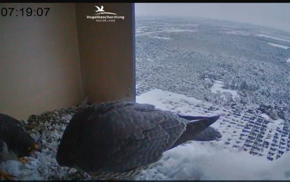 Rotsvast vertrouwen ging over naar zekerheid en zekerheid ging over naar het komt wel goed, maar dit is deze week overgegaan naar twijfel. Ik heb het over de komst van het 1e ei. M en V doen er alles aan om het kroost op de wereld... ehh.. Morteltoren te leggen, maar tot op heden nog niet succesvol. De slechtvalk-eieren in den lande vliegen ons in de chat als volle eierdozen om de oren, maar De Mortel behoudt haar achterstand op 020. Echter zoals we ieder jaar zeggen: "het blijft De Mortel en op De Mortel gebeuren de raarste dingen". Paringen, die op zich vrij essentieel zijn voor het onstaan van nageslacht, hebben we afgelopen wij niet veel mogen zien of horen, maar M en V kennende hebben die vast wel plaatsgevonden buiten ons blikveld en de magistrale camerazoektochten van Martin. De onrust, ontstaan door een vervelende 3e valk, lijkt deze week ook een stuk minder met uitzondering van hedenochtend. Hopelijk heeft die dubbelgeringde dame de kuierlatten genomen en is ze linea recta naar andere oorden vertrokken. In ieder geval konden spotters deze week melden dat op maandag er geen onrust meer was. Dan denk je dat het allemaal prima gaat, dan gaat het sneeuwen en niet zo beetje ook, maar voldoende om de halve kast onder te sneeuwen. Zie hiervoor de header foto. Ook voor De Mortel komt OZ goed op gang. Mijn dank gaat uit naar Bolid, Thaibird, Uiltje en alle andere die ik vergeet. Zonder jullie passie voor OZ is een weeksamenvatting niet te doen. Het aanbieden van prooien door M aan V gaat als een trein en niets lijkt er nog in de weg te zitten voor het leggen van het 1e ei. Geduld is een schone zaak, maar het is wel lang aan het duren.