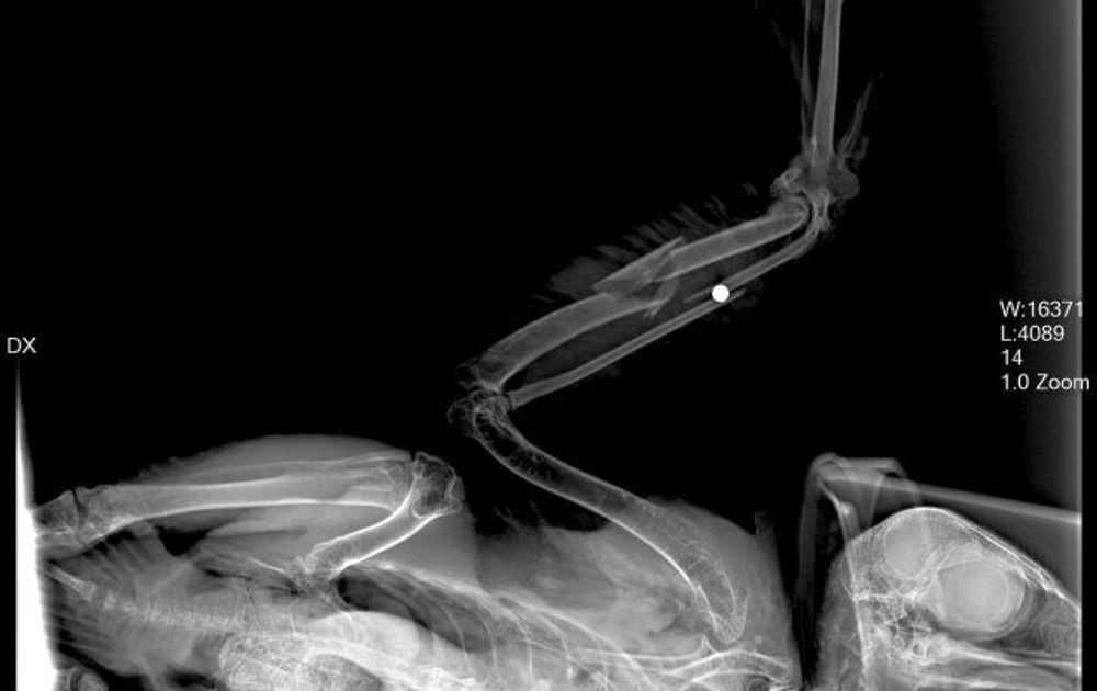 Een vogel met een schotwond en meerdere breuken, dat klinkt als het einde en is dat ook altijd het geval in vergelijkbare situaties. Maar nu niet, hoor. Een operatie was mogelijk, al was de kans op succes klein. Dierenartsen Carolien Hommers en Dirk Riemersma voerde een ingewikkelde operatie uit die drie uur duurde. De kogel werd verwijderd en de vleugel extern gefixeerd met pennen, die vier tot zes weken moesten blijven zitten. Na de succesvolle operatie kwam S2 bij uit de narcose, maar dan ging het weer (bijna) mis. S2 stopte plots met ademen! Dankzij een alerte assistente kreeg S2 mond-op-snavelbeademing (en dit is geen grap) en een hartmassage van dierenarts Caroline, S2 kwam gelukkig weer bij en de operatie was alsnog geslaagd.