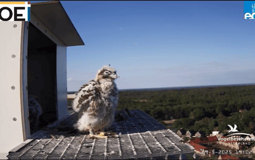 Rond de vierde week is het dons grotendeels vervangen door juveniele veren: bruinachtig met verticale strepen op de borst – heel anders dan het blauwgrijze verenkleed van volwassen slechtvalken. Die strepen zorgen voor camouflage in hun natuurlijke habitat: rotsen (die hebben we hier niet) en hoge gebouwen (die dan weer wel).
