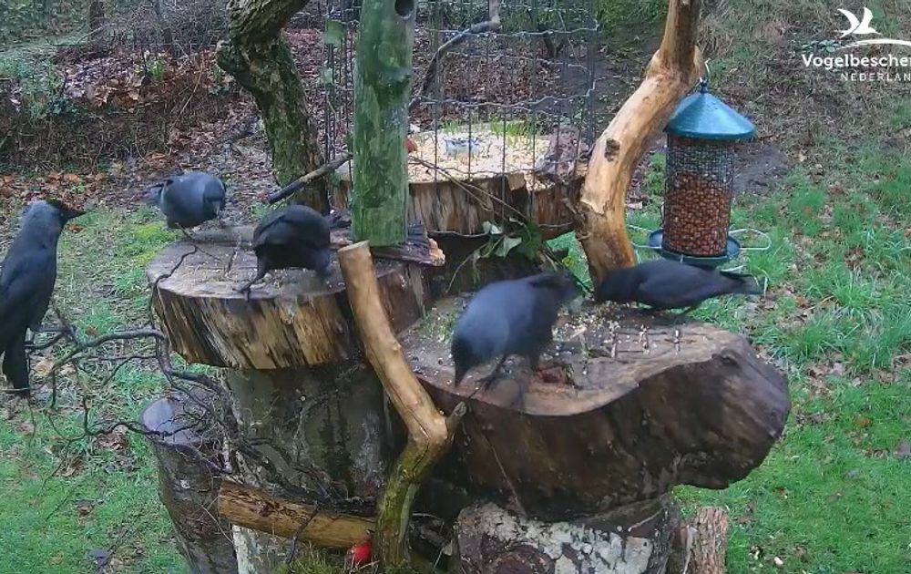 Op de voedertafel in Dongen is het altijd een gezellige boel als de kauwen even langskomen.