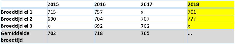 Kuukeen heeft 701 uur in het ei gezeten. Dat is korter dan afgelopen jaren (zie tabel hierboven). Een verklaring hiervoor kan zijn dat V minder minuten de kast heeft verlaten tijdens de broedtijd dan voorgaande jaren.