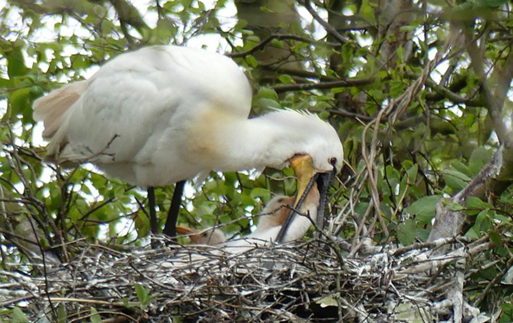 Nu begint ook de drukke tijd voor de ouders. Zij zullen continue heen en weer moeten vliegen om voedsel naar de kuikens te brengen. Lepelaars voeden hun jongen met voedsel uit hun keelzak, dat geel-rode stukje huid onder hun snavel. Ze vangen vissen en andere waterbeestjes en vervolgens kunnen kuikens dat uit de keelzak opeten (zie foto). De kuikens zullen daarbij voortdurend bedelen door met hun kopjes op en neer te schudden en dit geluid te maken.