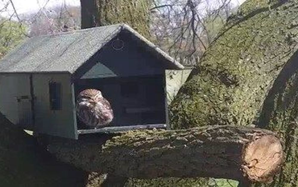 Meneer lekker op de veranda, te genieten van de zon. Maar de zaken zijn gewijzigd, donderdag begon het gepiep of gewiep. En wat waren de kijkers blij! Geluid uit de eitjes! Het duurde nog een kleine dag tot vrouw terug begon te "praten". Een enkeling dacht de kuikens in het ei te horen pikken (regen) er werd eierschaal gezien (was het niet). En man, die kwam een muis weghalen, uren later zat ie met een muis op de tak. Hij vloog er weer mee weg. Voor zijn opbergplaats? Heeft hij ergens een muiskluis?