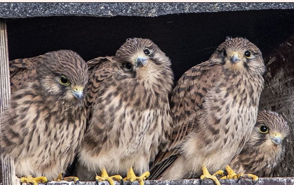 De buitenwereld begint te lonken voor onze zes torenvalkjes. Regelmatig zitten ze alle zes op een rijtje op de rand van de kast, elkaar verdringend om het beste uitzicht te hebben. Als dat maar goed gaat!