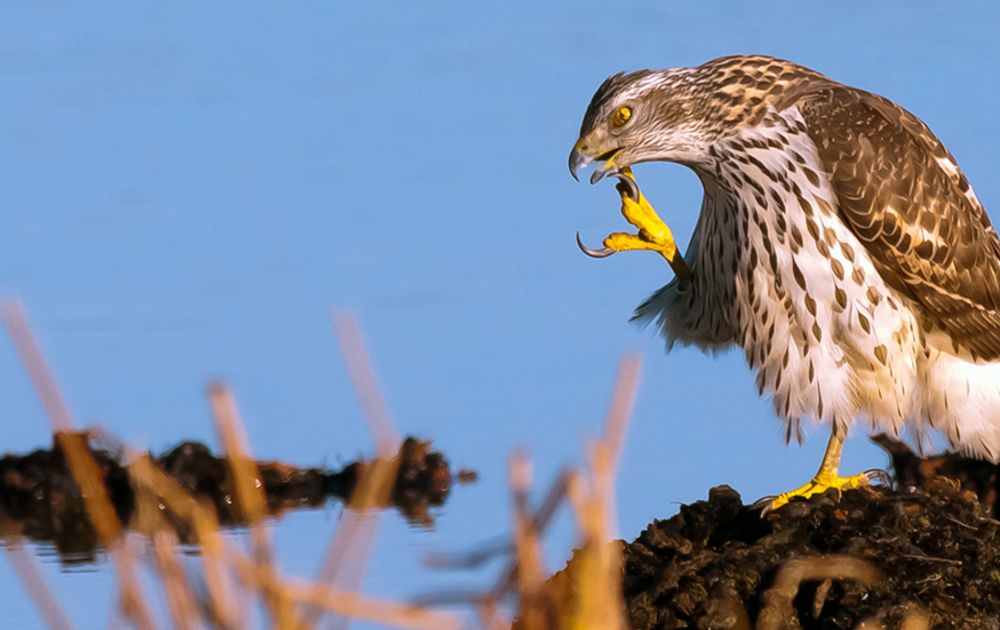 De zeearenden hoor je af en toe roepen op de achtergrond, evenals buizerds die zich ook in hetzelfde perceel dreigen te vestigen. De strijd tussen de havik en zeearend was afgelopen jaar een heet hangijzer. Wordt dat het dit jaar ook of is het al beslecht? Vanuit het veld is te zien dat de zeearenden drukdoende zijn met hun nest van verleden jaar. In de dunne dode boom hebben ze het uitgezakte nest opgekalefaterd. “Is dit wel zo verstandig meneer en mevrouw arend? Als ik jullie was, zou ik een ander nest kiezen en ik weet ook wel welke.”
