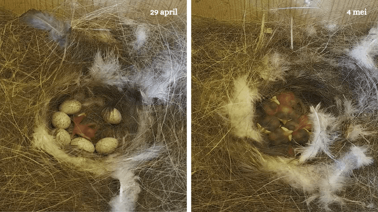 Eerder hebben we voorspeld dat de kuikens op 28, 29 of 30 april uit hun eieren zouden kruipen. Ze hebben ons goed in spanning laten wachten. Op 29 april zagen we het eerste kuiken verschijnen. De volgende vier kuikens vonden 30 april een mooie dag om hun eieren open te breken. Kuiken 6 volgde weer wat later, in de nacht van 30 april op 1 mei. En later die dag, rond 19.40 uur, brak ook het zevende en laatste ei open. Alle zeven pimpelmeeseieren zijn dus uitgekomen, wat fijn! Kuiken nummer 7 is wel wat kleiner dan zijn broertjes en zusjes, maar hij lijkt goed mee te komen.