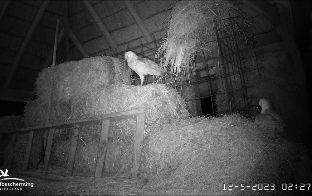 Vrouw jaagt nog niet echt mee, maar moet in de nacht van 11 op 12 mei tegen een goede kans zijn aangelopen: ze kwam ineens met een gigantische woelrat aanzetten! De woelrat is zichtbaar aan de zware kant voor vrouw kerkuil; in de clip is te zien hoe ze hem eerst naar de bovenkant van de hooiberg zeult voordat ze de sprong naar de kast waagt. Daar kan het kroost goed mee vooruit!