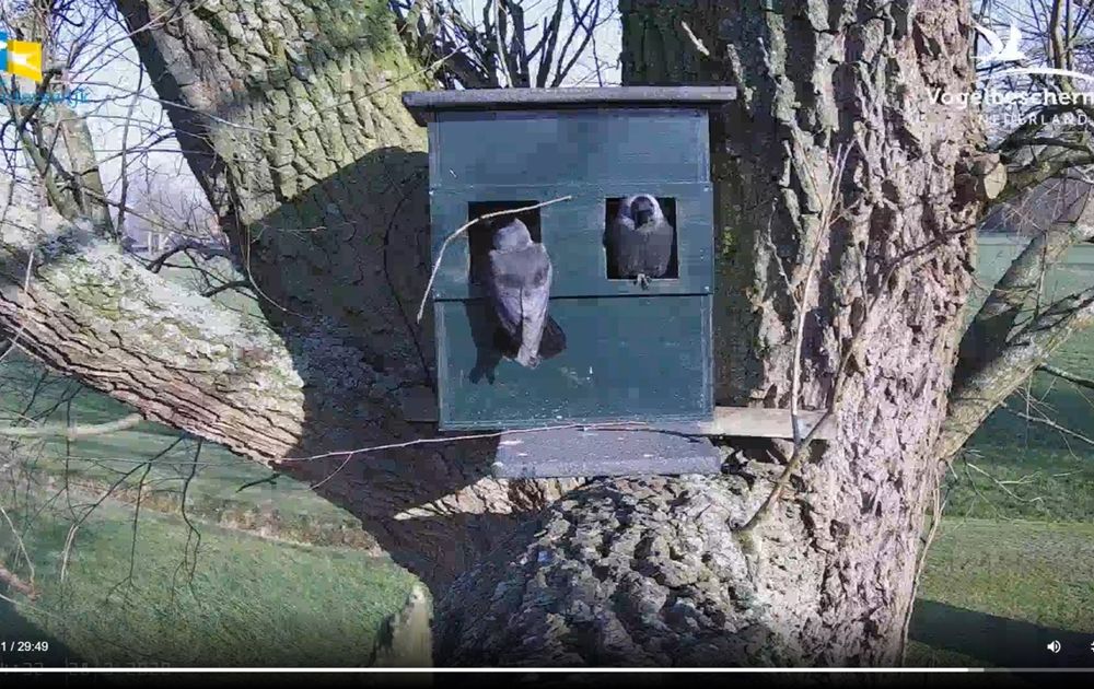 Ook op en rond de cameralocatie wemelt het van kauwen. Toen ik afgelopen week langs het aangrenzende weiland liep, telde ik er 20. Druk bezig emelten en andere insectenlarves te zoeken. Op het erf is plek voor 3 of 4 paartjes. Waar die andere dan toch zitten? Ik zal de komende weken eens gaan opletten. Tijd genoeg. Een ei gaat er denk ik nog niet heel snel komen. Met dit bouwgestuntel zijn we zo weken verder; man lijkt bovendien ook nog niet erg in de mood. Ook opvallend, meestal is het andersom.