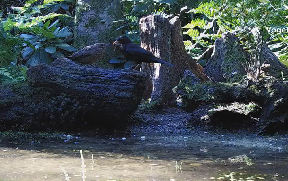 Een bonte specht en een merel nemen gelijktijdig een bad.