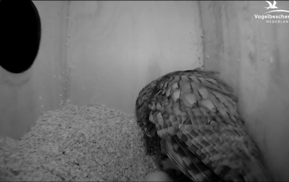 Vrouw bosuil begint om 06.05 uur te persen; om 06.11 uu laatste pers (ei gelegd) en rust daarna even uit. Om 06.22 staat ze even op en is het eerste Beleef de Lente-ei zichtbaar.