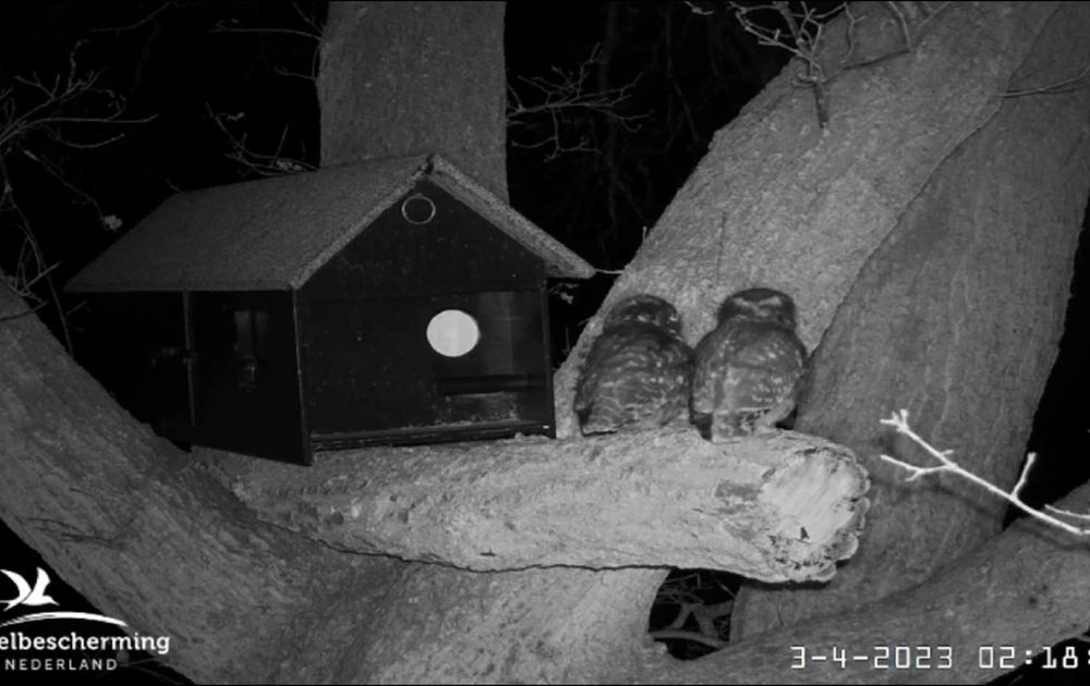 Man snelt te hulp als een andere steenuil verweg roept.