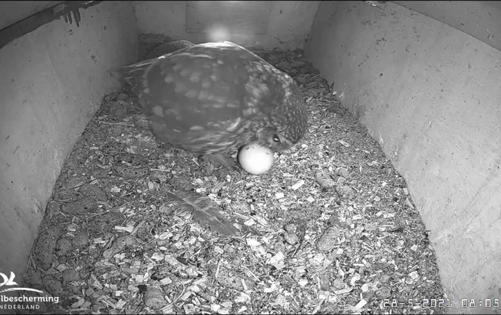 Voor Man steenuil hoort het afgesplitste ei erbij, voor Vrouw minder. Zij "bedelsnurkt" door als Man het ei onderzoekt.