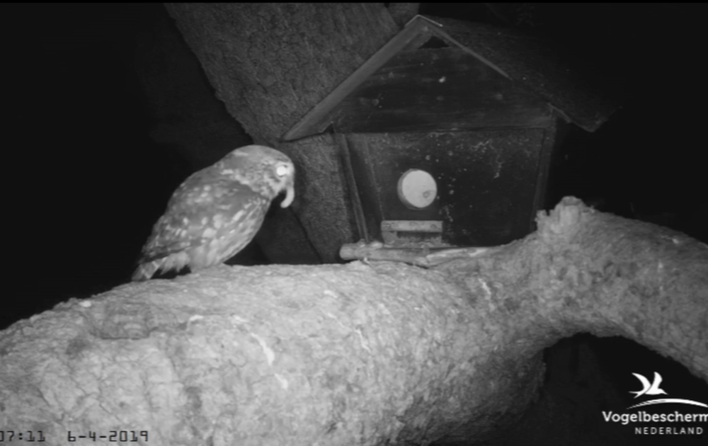 Vrouw steenuil blijft overdag broeden, en man steenuil start met het brengen van prooien in de nestkast vandaag (6 april). Rups, muis en rups.