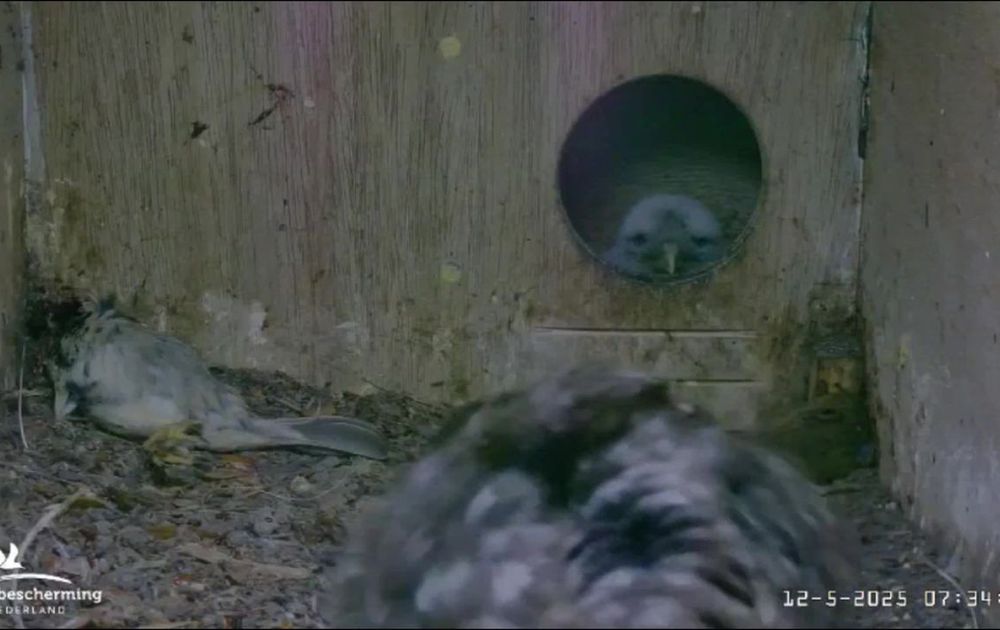 Het kuiken is nog steeds in de sluis en lijkt van plan daar te blijven. Vrouw steenuil past zich aan aan de situatie.