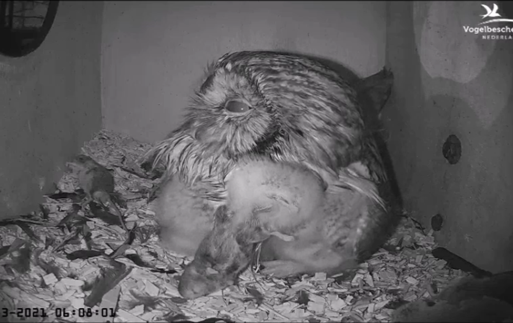 *Door het vlieggat zien we man bosuil op een tak verschijnen