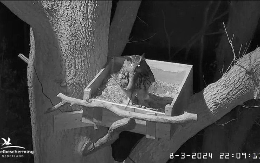 Gisteravond even na 22:00 uur bracht M weer een mooie grote prooi voor V. V bracht die weer weg, zodat het nest voorlopig nog schoon blijft.