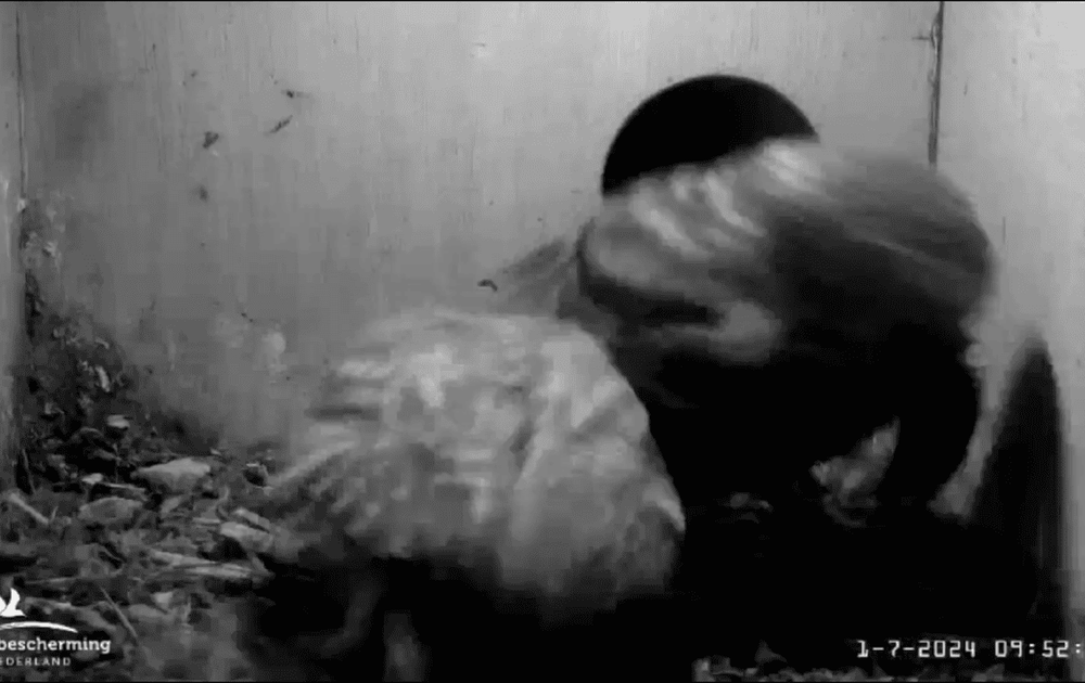 Rechtspoot heeft nu deze voorraadmuis in de nestkast. Geen rustig bezit als Vrouw steenuil binnenkomt.