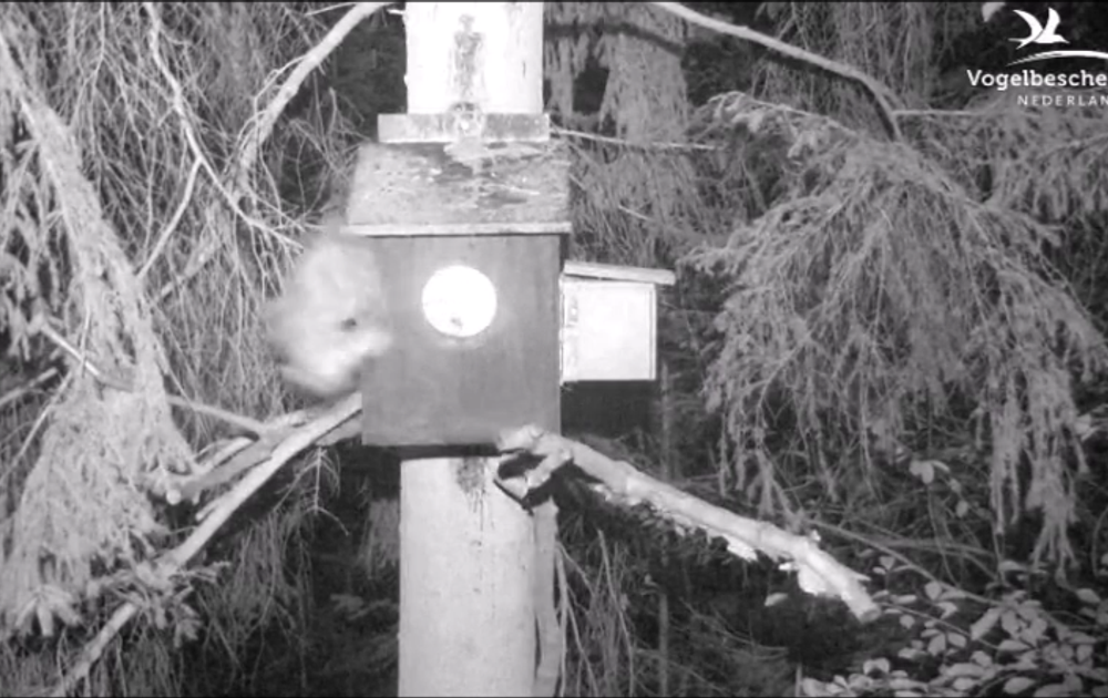 Handig klimt hij later in de takken van de boom links naast de nestkast naar boven en fladdert dan uit het zicht.