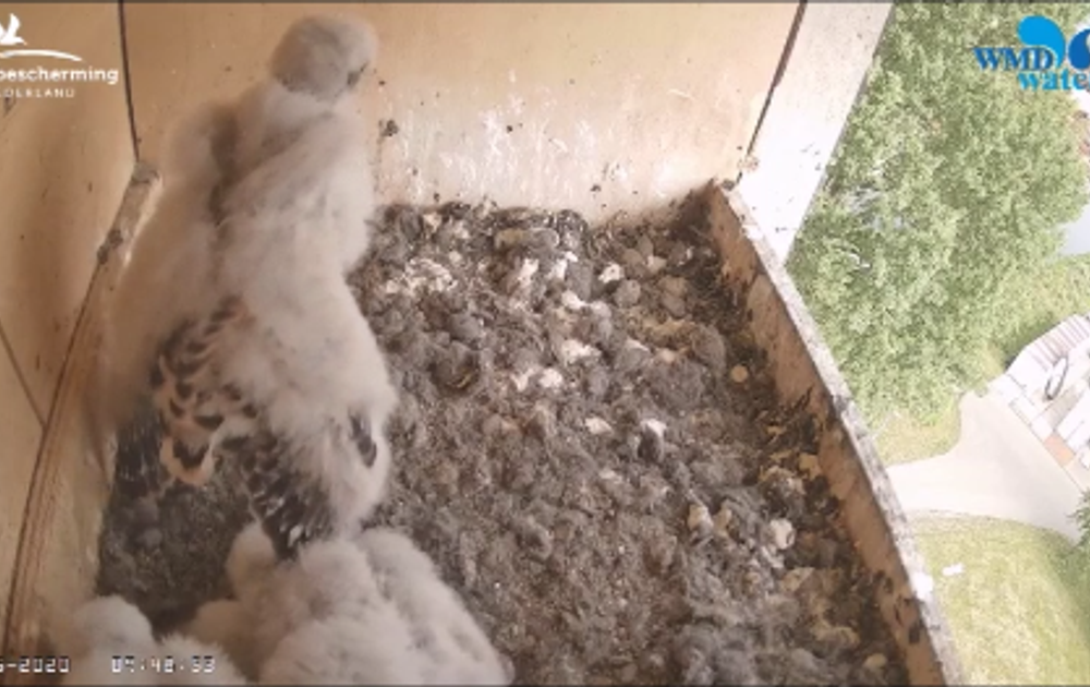 De jonge torenvalken hebben inmiddels wel door dat als je op een kluitje blijft liggen je niet echt veel leert. Dus hebben ze vandaag de hele kast goed benut als oefenruimte