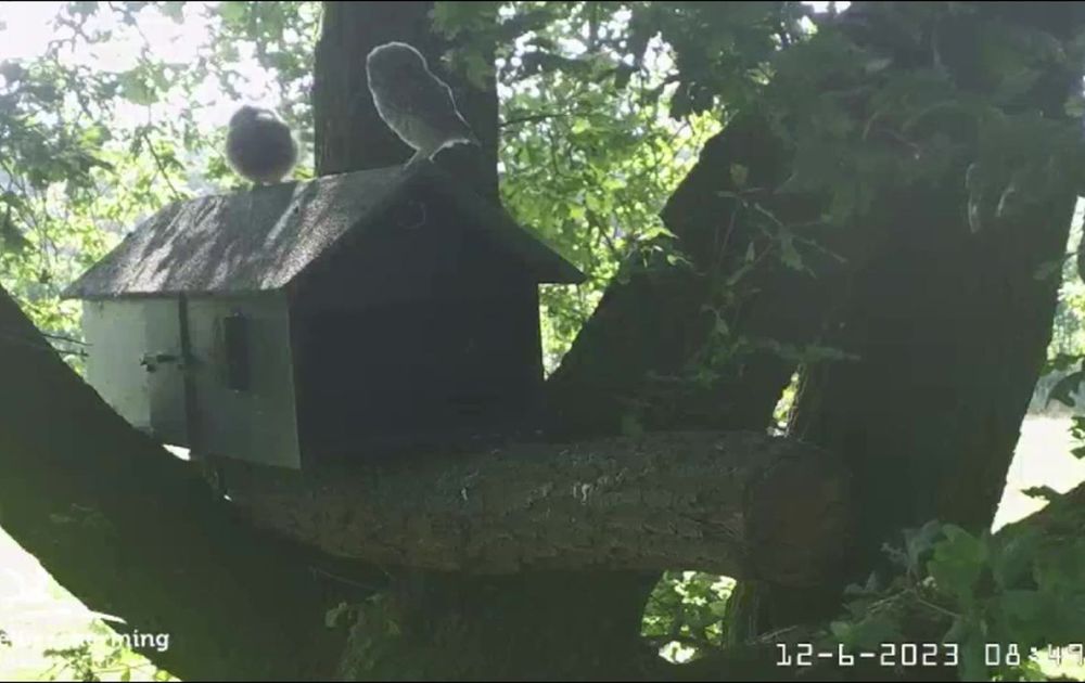 Waarschuwingsroep, één van de vier jonge uiltjes reageert niet, te ver weg?