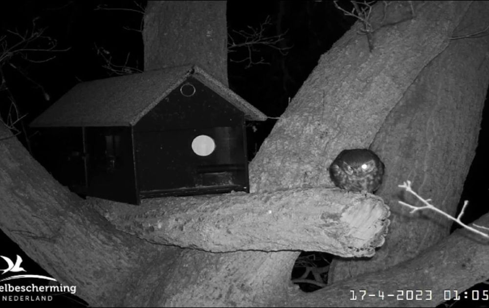 Man steenuil slaat alarm. Vrouw reageert. Een derde steenuil roept.