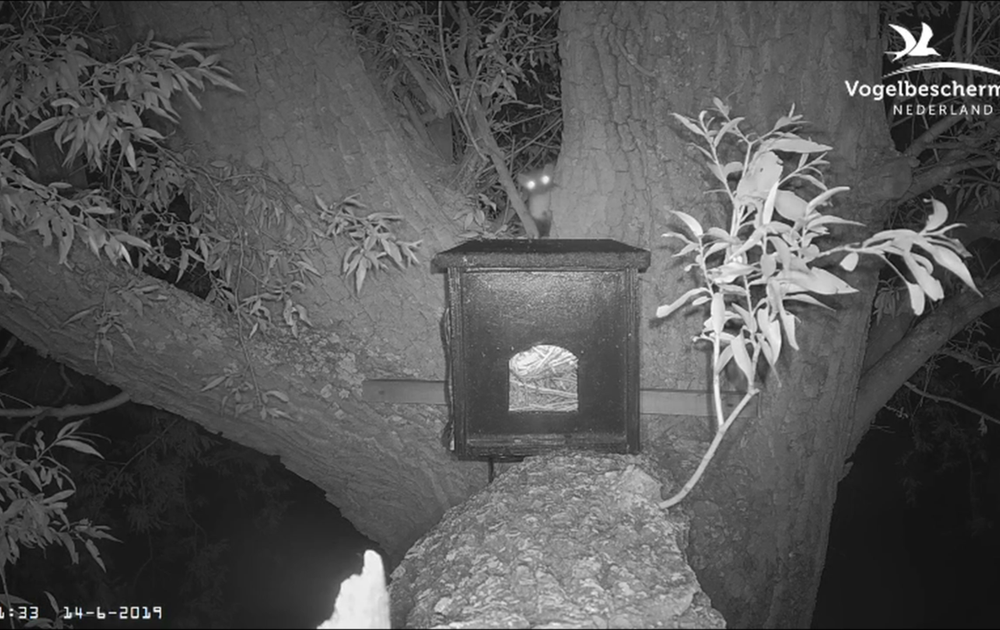 De steenuil slaat weer eens groot alarm. Niet voor niets: bij de nestkast van de kauwtjes, 30 meter vanaf de eigen kast, komt midden in de nacht een steenmarter langs. Een steenuil schiet door het beeld.