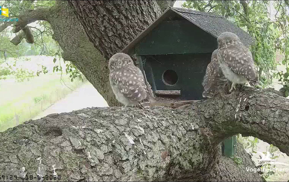 Na een geluidje van een ouder steenuil gaan de jonge steenuilen snel de veilige nestkast in.