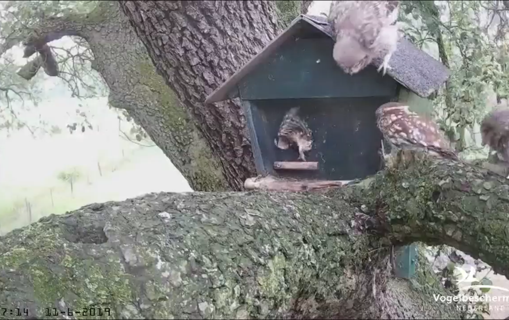 De steenuilkuikens zijn uitgevlogen, in de nacht zwerven ze door het territorium, maar voorlopig is de nestkast nog wel het thuis. Op 11 juni kwamen er nog 50 prooien in beeld.