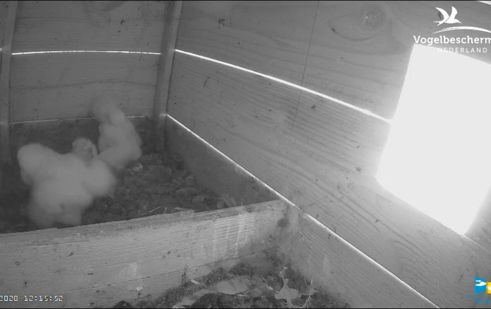 Vandaag zijn de kuikens voor het eerst een dag alleen thuis. Ze zijn nu groot genoeg om zelf te eten dus zal vrouw vaker de dag ergens anders doorbrengen.