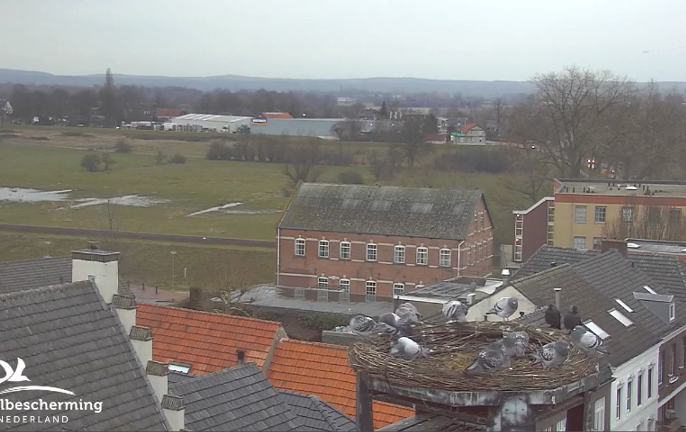 Vandaag zijn de ooievaars uren niet te zien geweest op het nest. Waarschijnlijk zaten ze bij de poel. Duiven en kauwen bezoeken dan het nest. Voor de duiven is het nest een soort verzamelplaats. De kauwen komen kijken of er nestmateriaal te stelen is voor hun eigen nest. Bovendien hebben ze een prachtig uitzicht over het marktplein van Gennep. (zie foto in clip “Start seizoen”.
