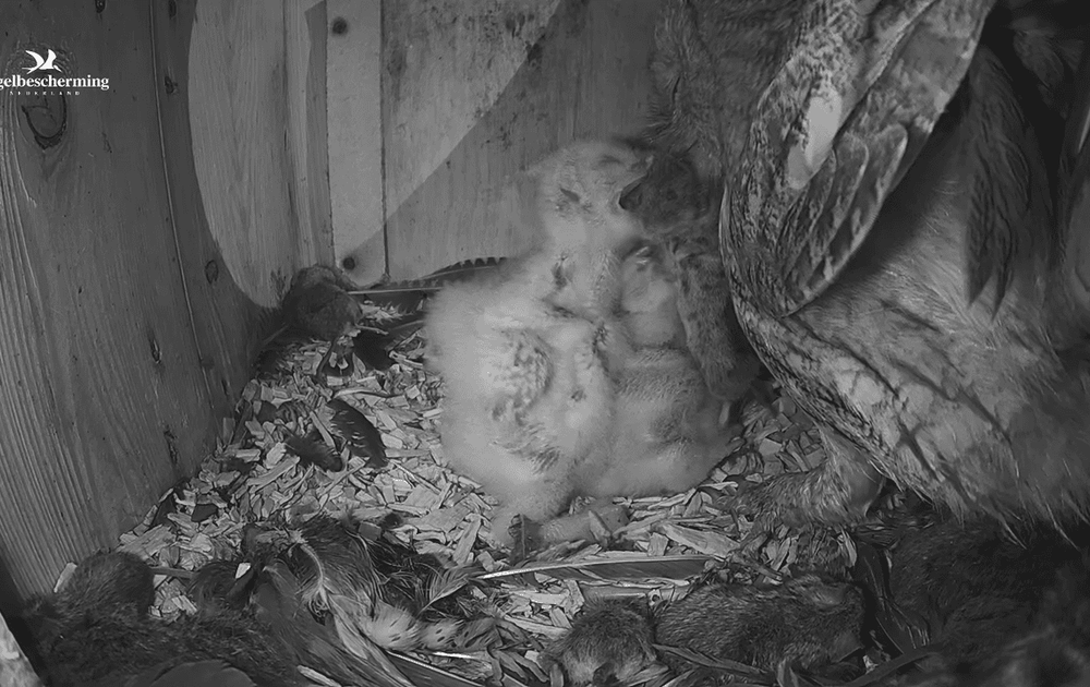 Ook mooi te zien in deze clip: het verschil tussen de oudste drie kuikens en nakomertje nummer vier en de oogjes die bij het kuiken vooraan (waarschijnlijk kuiken 1) al aan het open gaan zijn.