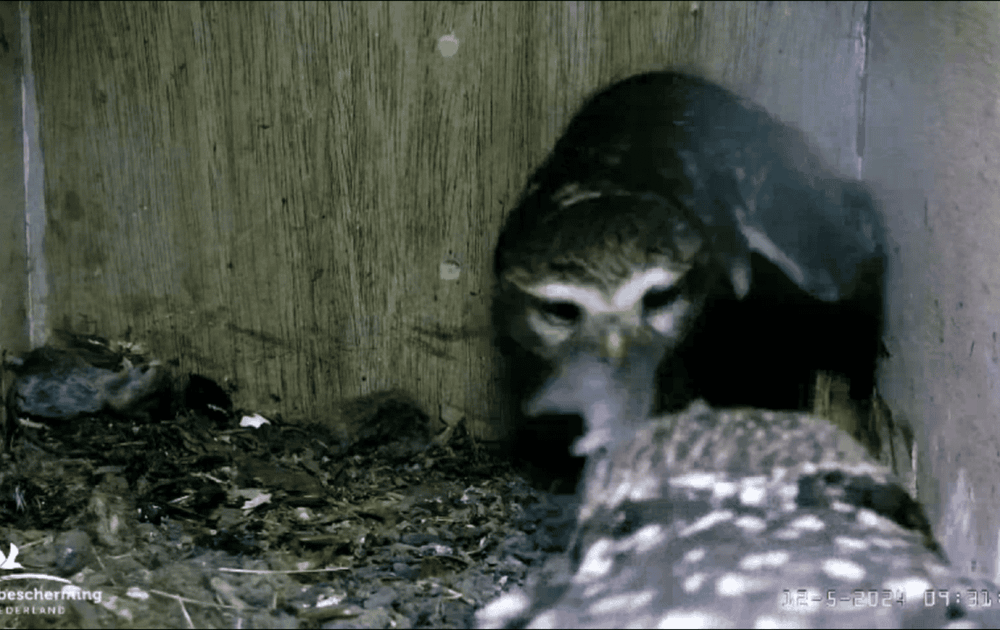 Op deze locatie nog niet in beeld: spitsmuizen. Man steenuil brengt 2 spitsmuizen. Steenuilen schijnen niet erg van ze te houden, maar deze "spitsen" gaan er goed in.
