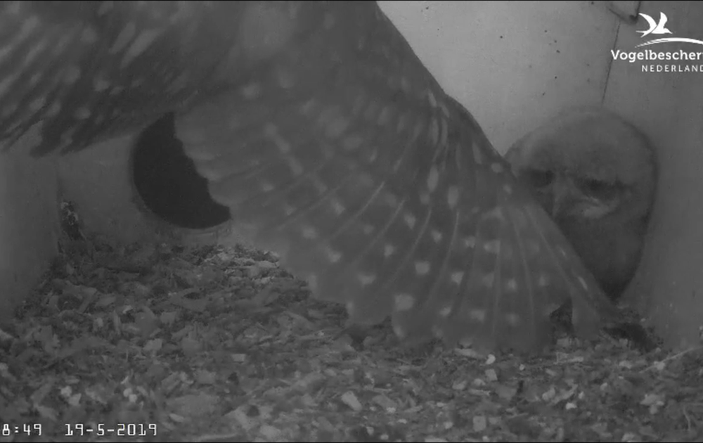 Vrow steenuil verricht halsbrekende toeren in de nestkast. Drie keer!