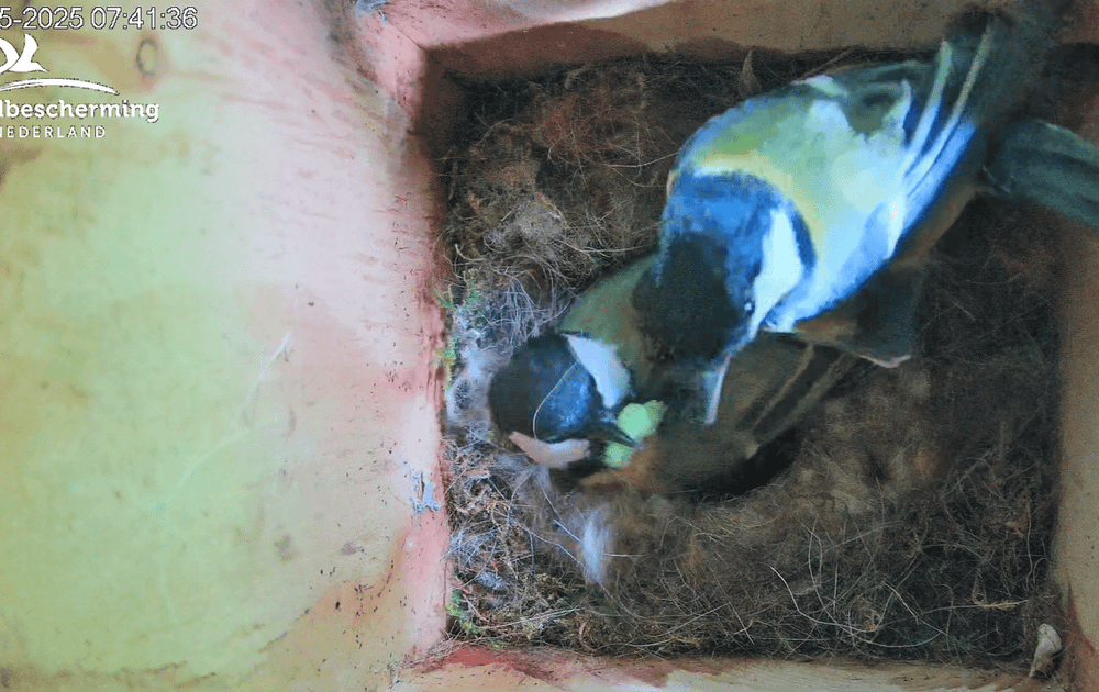 Het vrouwtje is gisteren begonnen met broeden en man zorgt prima voor haar. Ze heeft de hapjes die man haar brengt ook wel nodig - vanochtend heeft ze er nog een eitje bijgelegd! De teller staat op acht.