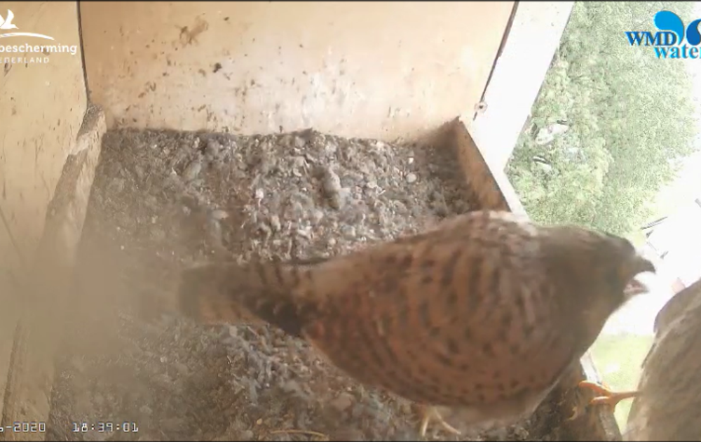 Een paar fikse buien zorgen er voor dat de kast weer in de belangstelling staat. Eén van de jonge torenvalken zit al een tijdje binnen en is al aardig opgedroogd als een volwassen torenvalk (m/v?) ook op de drempel komt (na drie mislukte pogingen). Uiteraard meteen flink bedelen en met een behoorlijke 'lichamelijke expressie'.