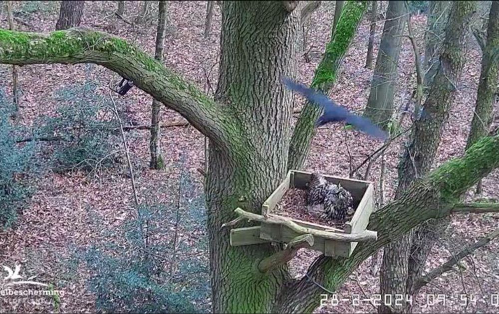 Vrouw Oehoe zit voor het eerst een hele morgen op het nest.